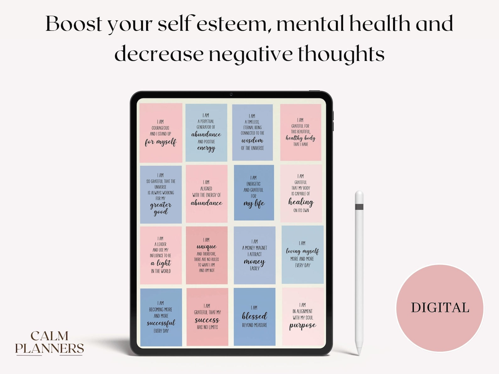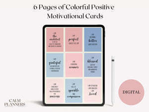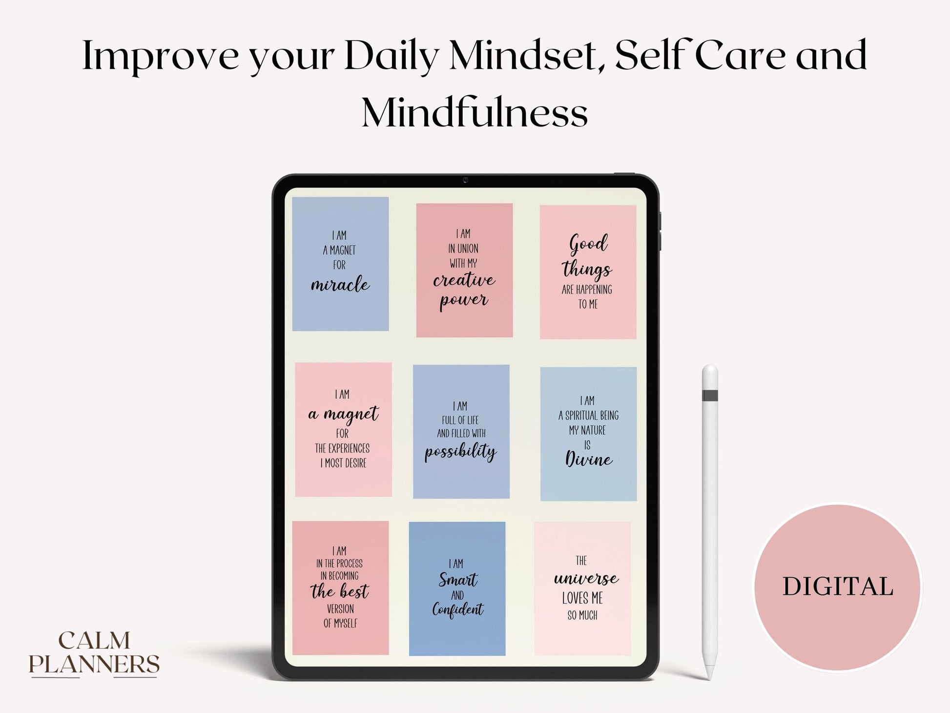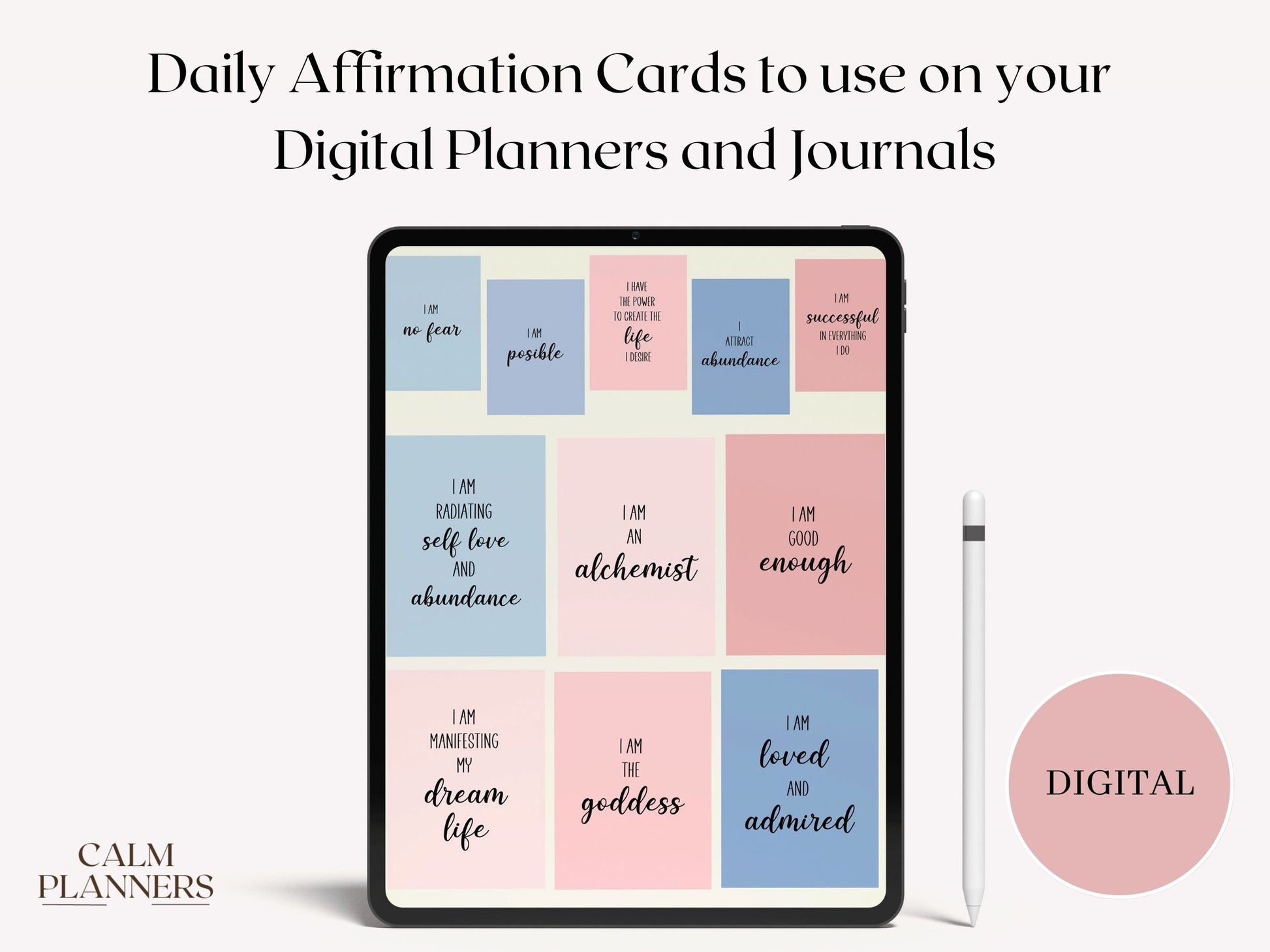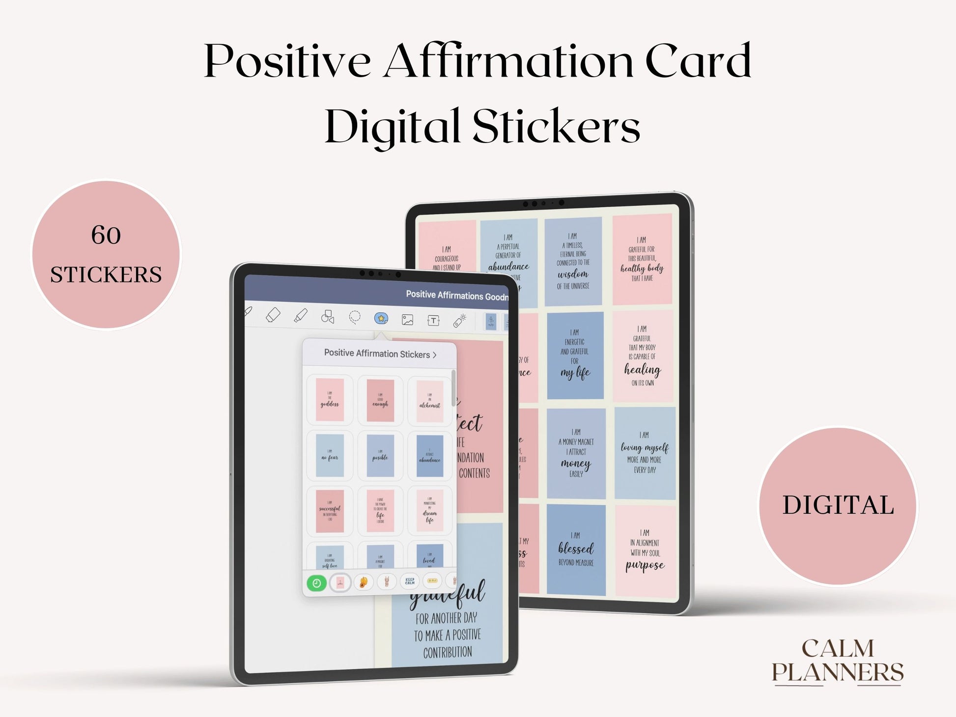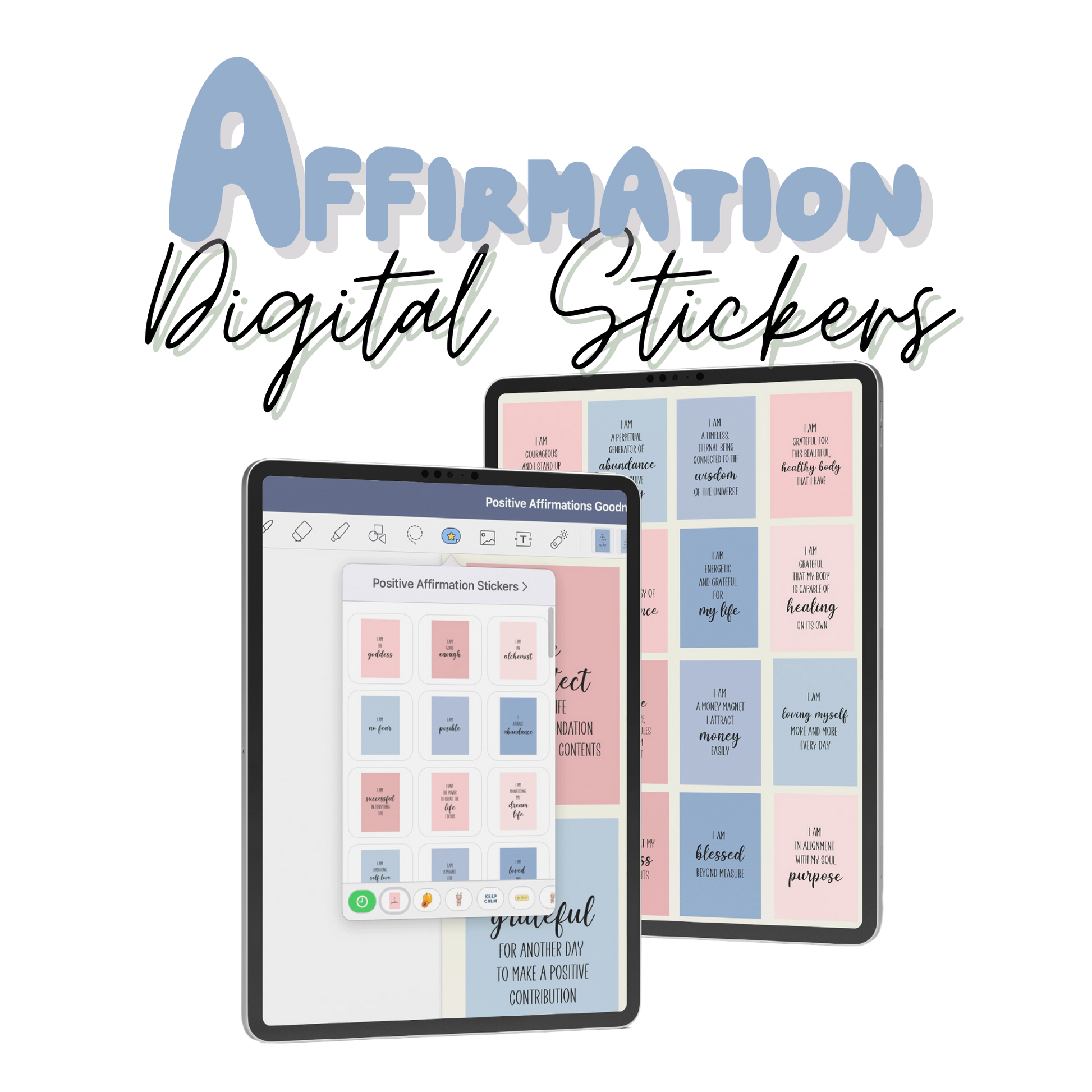 Use them with digital planners and digital journals as well as any device as wallpaper, or print them out and make your own oracle affirmation card deck or stick them in your paper planner. Start your day with positive quotes and messages to fill your mind with motivational and good thoughts throughout the day. With these digital stickers, you can add a touch of daily motivation to your digital planner, digital journal, Goodnotes book, vision board and much more. Whether you want to be reminded of your self-worth and power, or need to boost your positive attitude, our Digital Stickers are here to help!