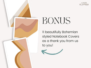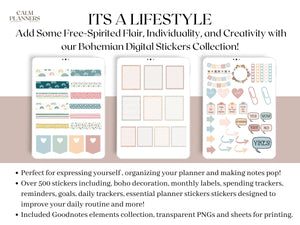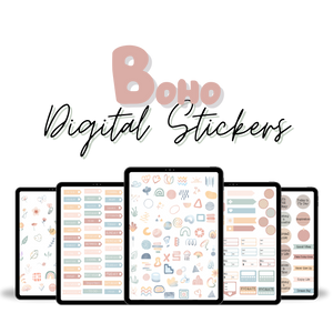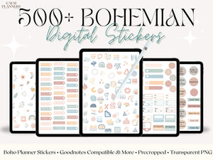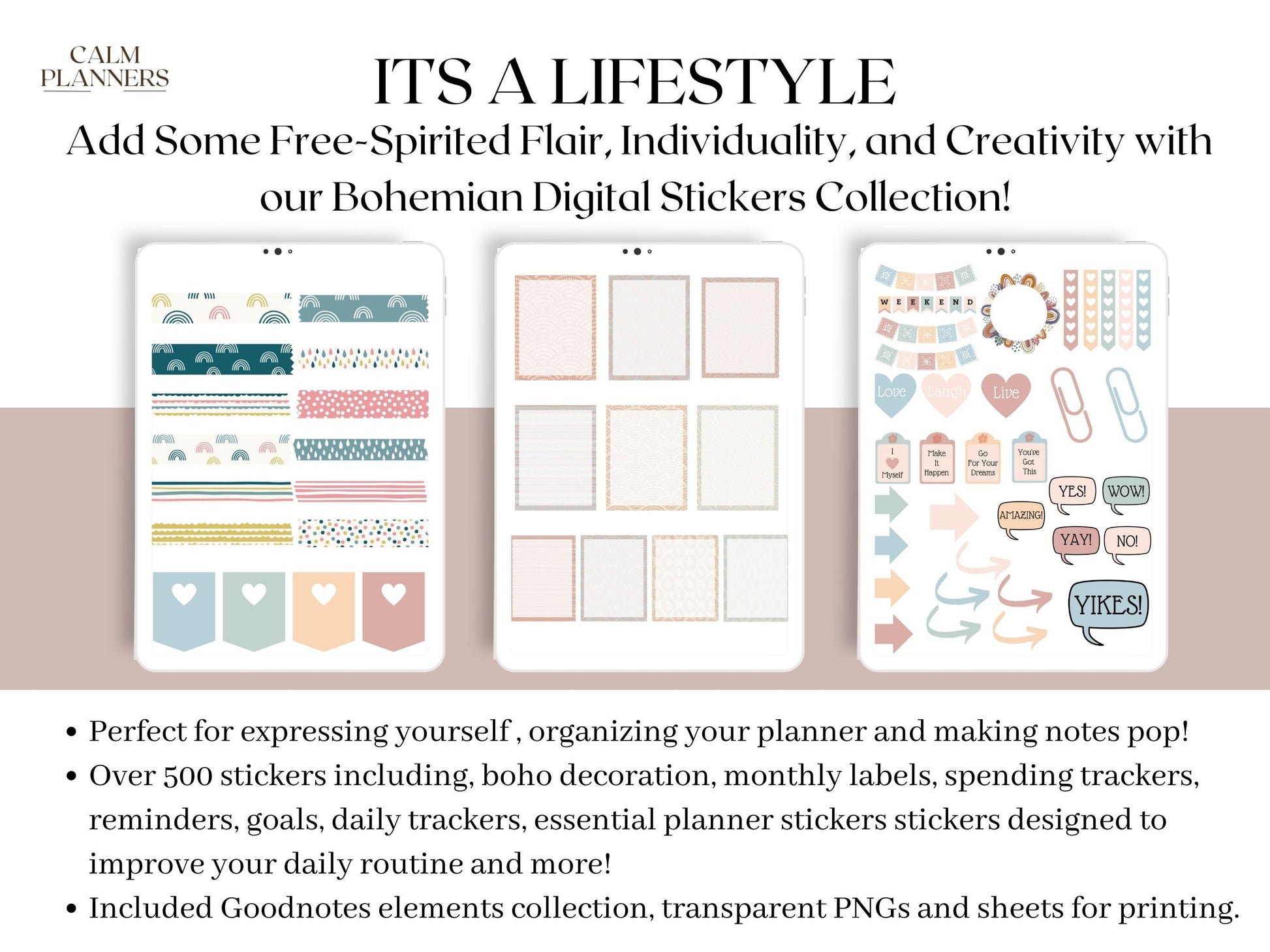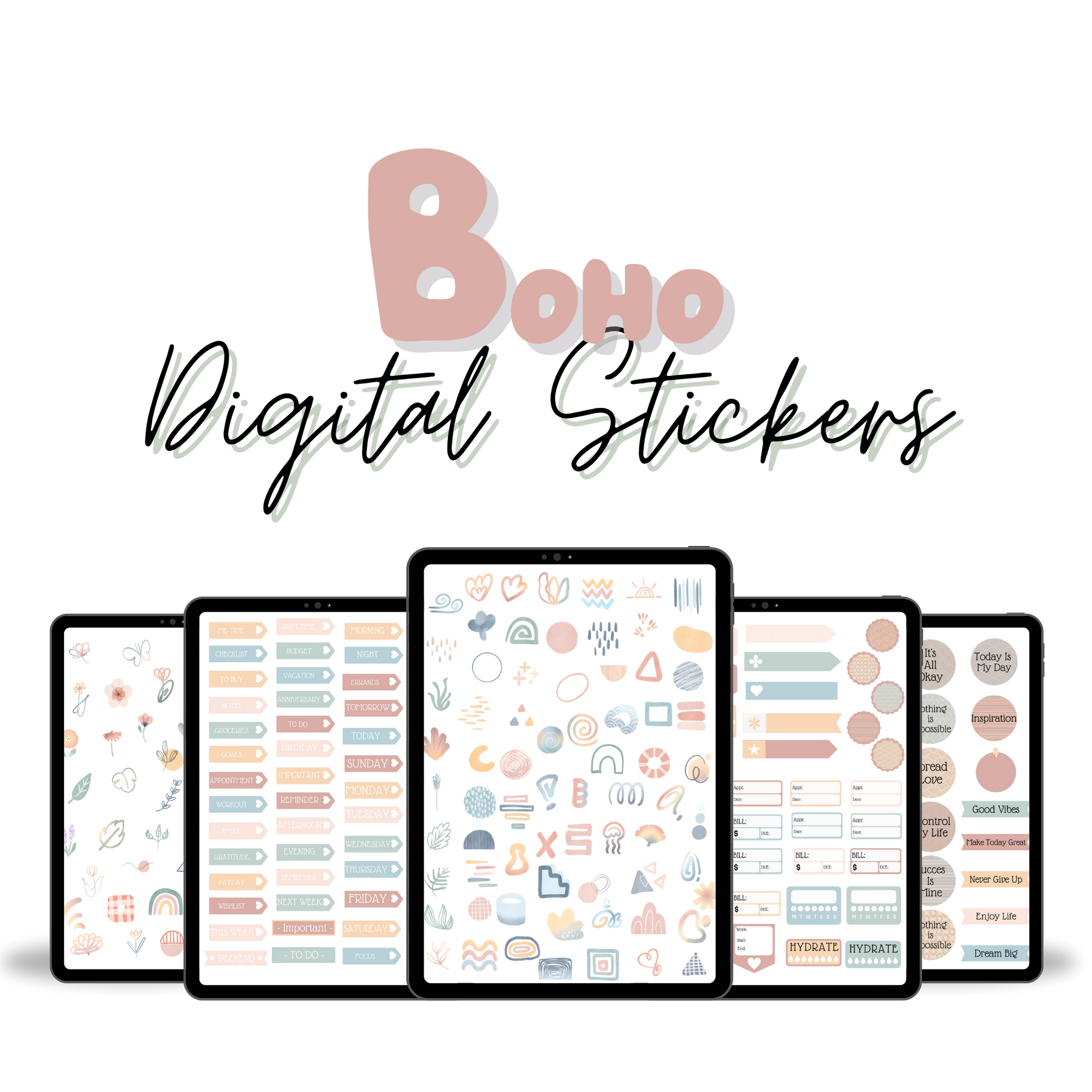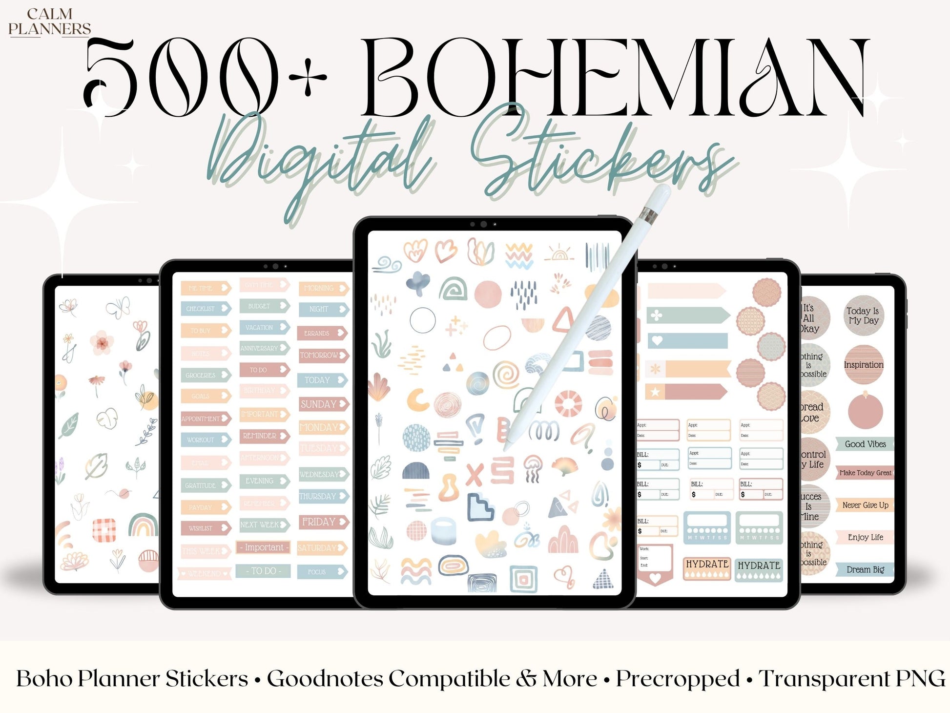 These Boho digital planner stickers of over 500+ digital stickers is made up of both functional planner stickers and fun artistic stickers to decorate and improve your planner. This bohemian bundle includes Icon stickers, washi tape, post it notes, arrows, words stickers, number stickers, trackers, reminders and many many more.