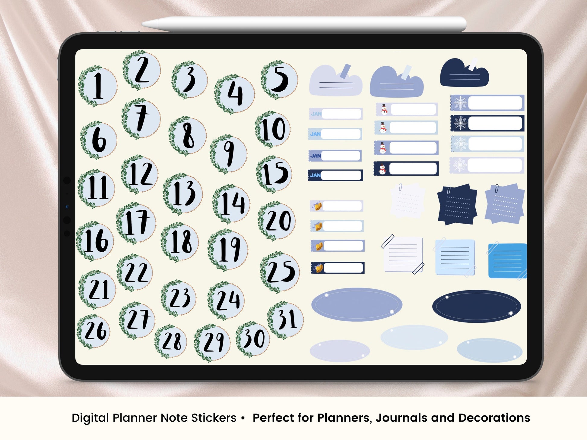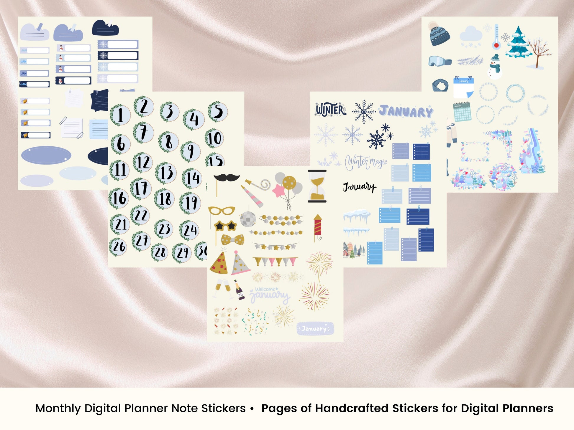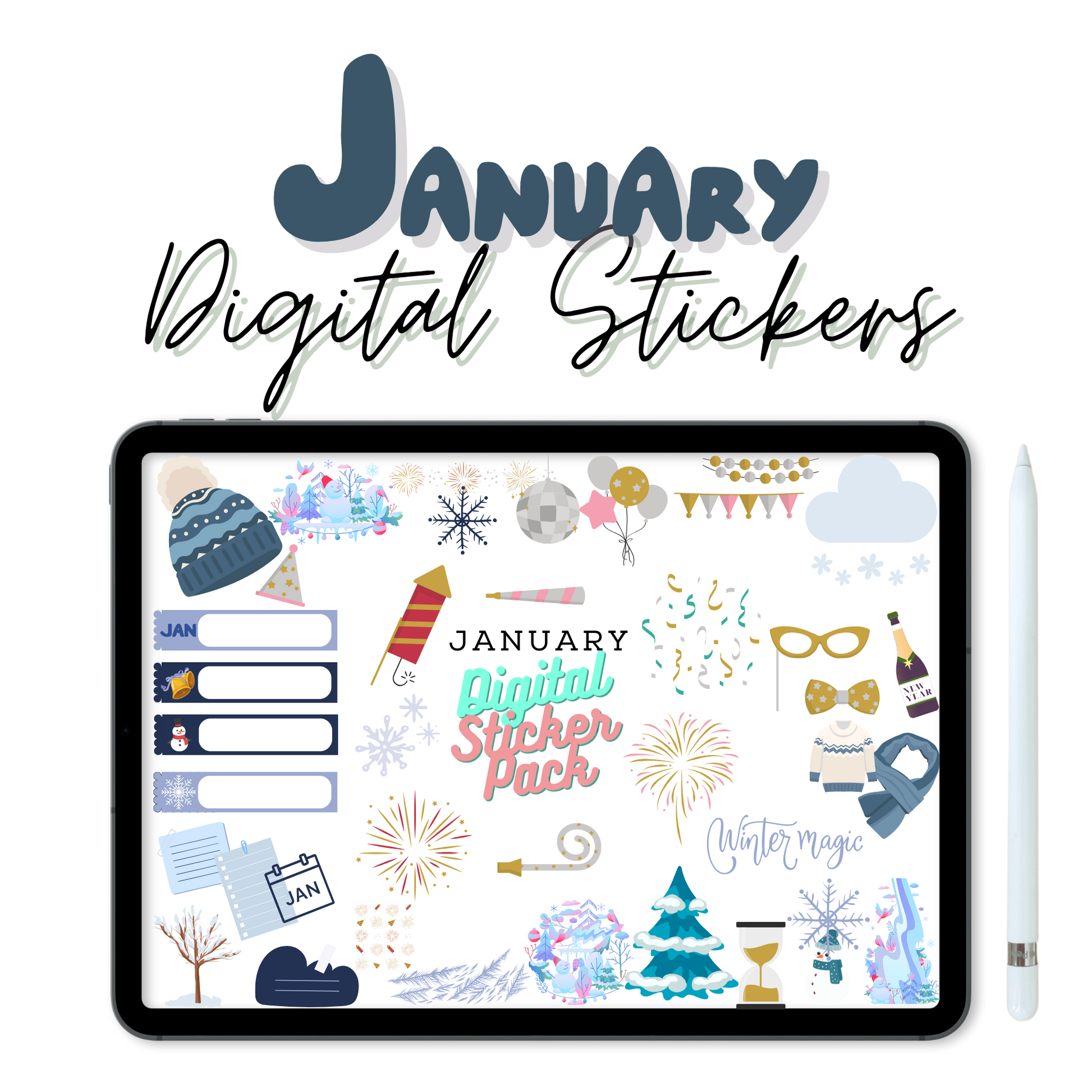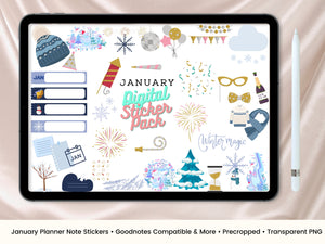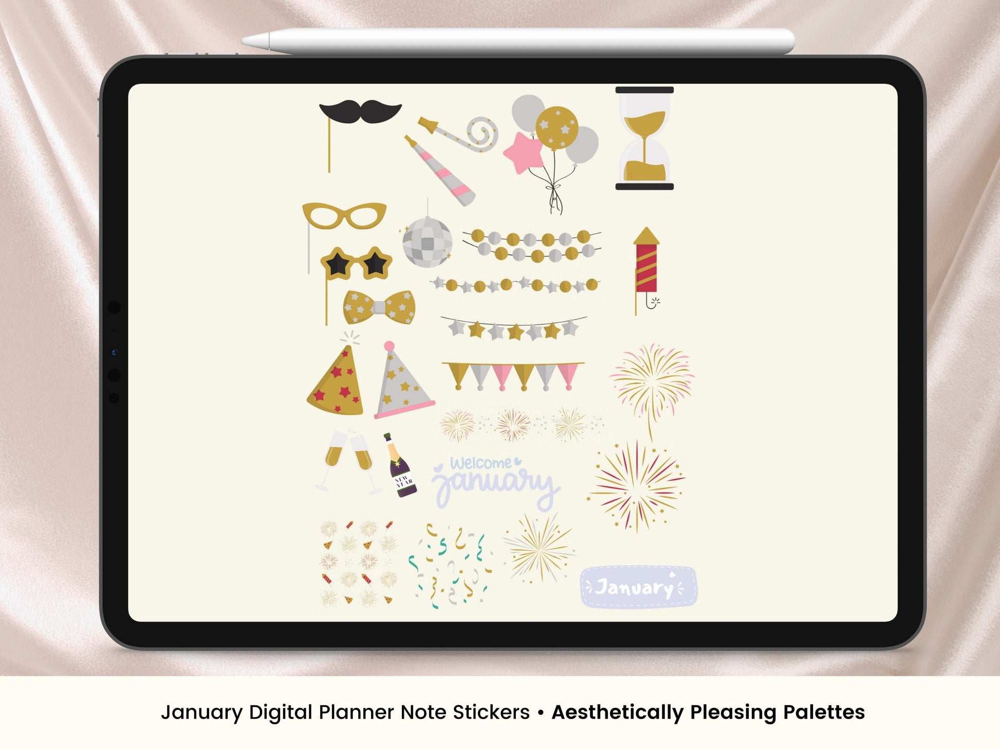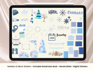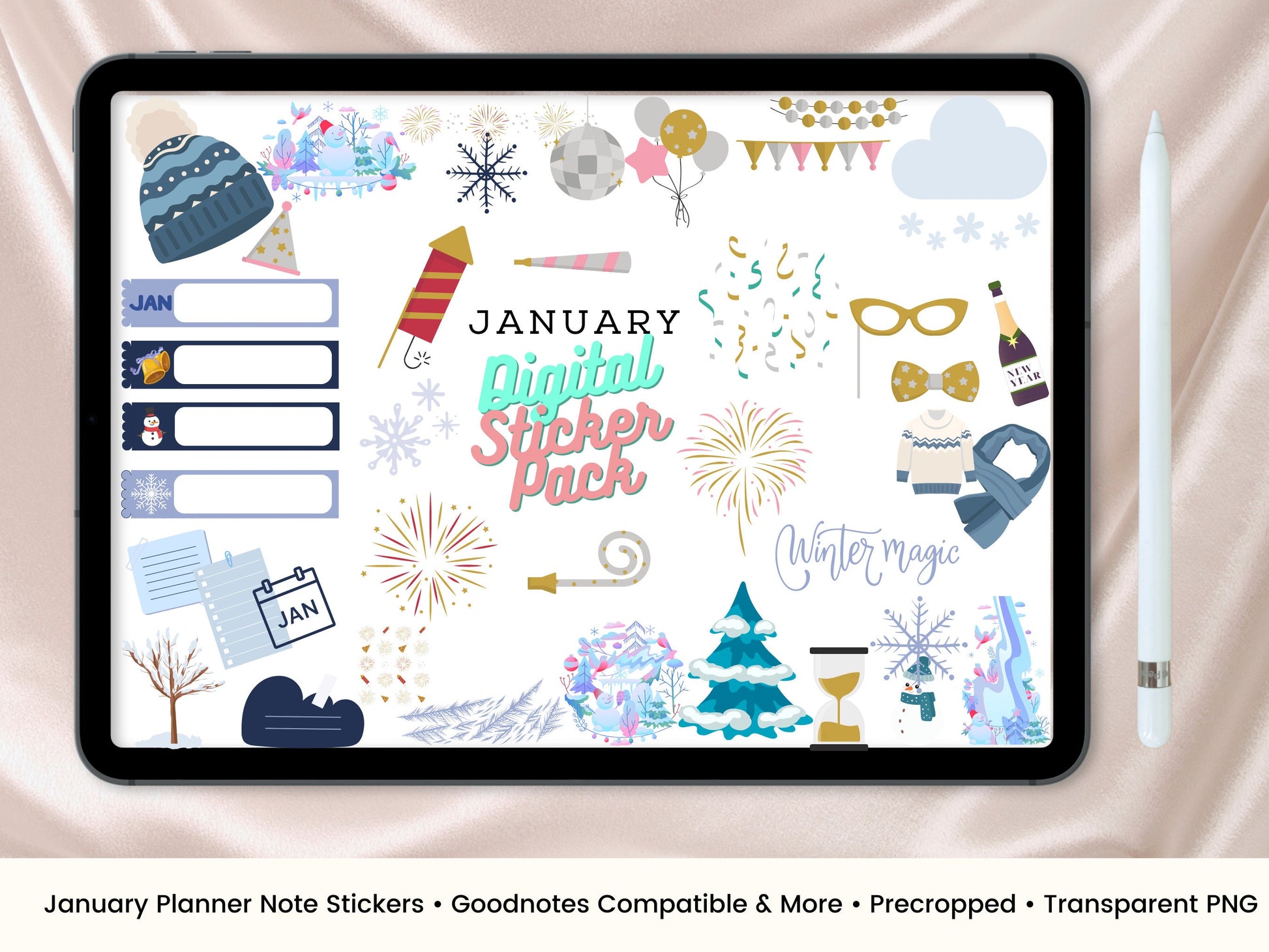 Celebrate the New Year with January goodnotes digital stickers and jump right into the year feeling organized and inspired! This Monthly Digital Planner Stickers set comprises over 130 original seasonal and holiday-related digital planner stickers to decorate your Month! Decorate your planners with aesthetics curated for the month of January. Our stickers come already PRE-CROPPED and with a Goodnotes book! Hand-drawn stickers to use with your Goodnotes planner and other digital planners! They are versatile and instantly transform your planner pages. Mix and match stickers to suit your personal style.