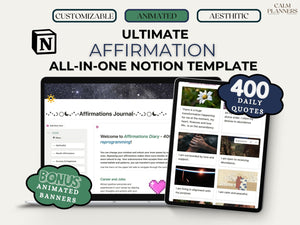 Unveil the power of positivity and intention with our exclusive "Notion Affirmation Template". This beautifully crafted template is more than just a tool; it's a journey towards manifesting your best life. With over 400 carefully selected affirmations, this all-in-one Notion template is your gateway to enhancing every aspect of your life - spirituality, beauty, wellness, personal development, career, love, and wealth and success.