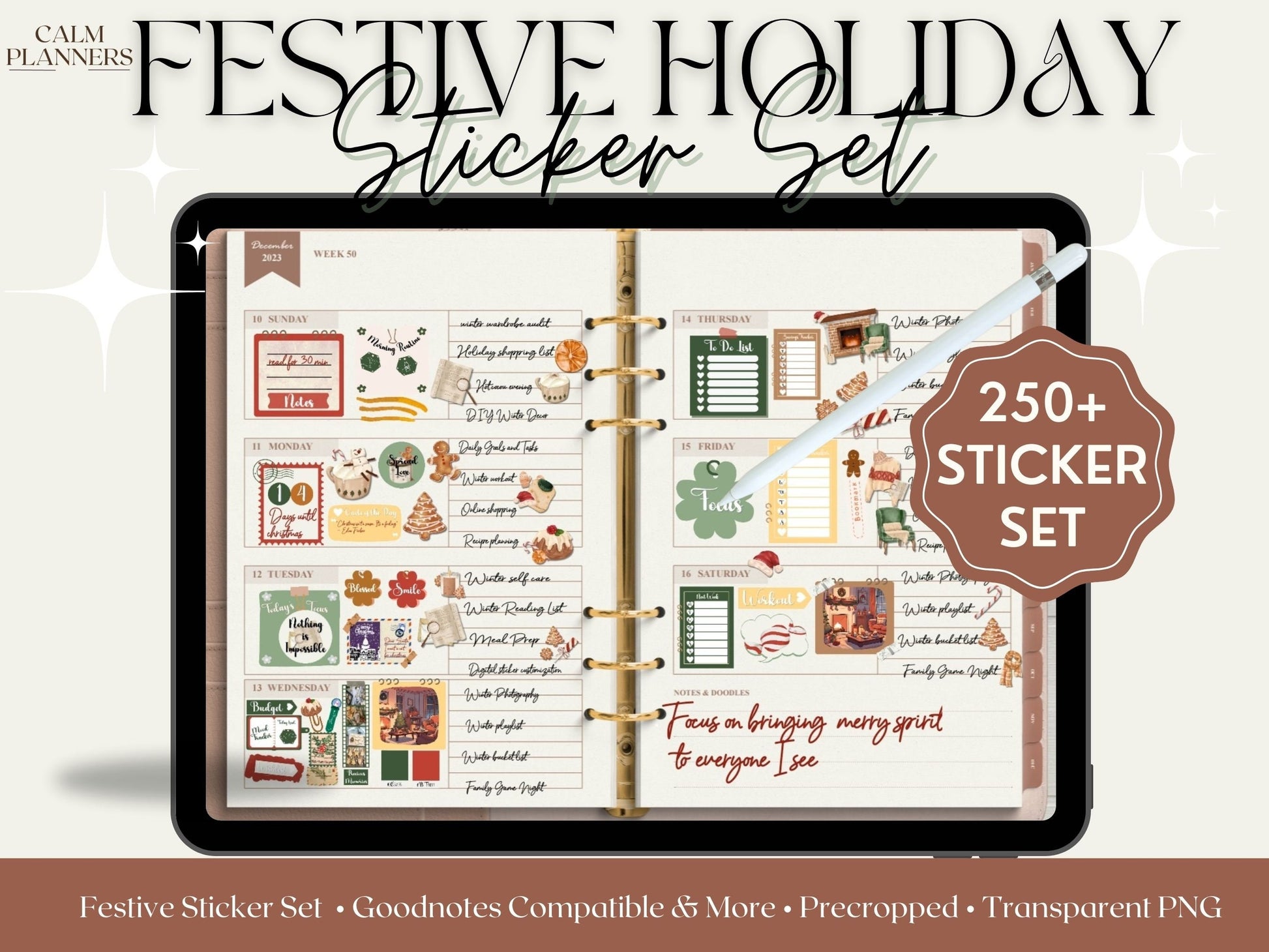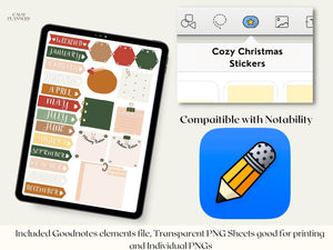 Elevate your digital planning with our Christmas Sticker Pack! With 250+ pre-cropped stickers designed for Notability and GoodNotes, the possibilities are endless. From festive everyday essentials to seasonal delights, let your creativity shine as you craft a cozy winter wonderland in your planner. Transform your iPad planning experience and infuse the spirit of the season into every page. Get ready to embark on a holiday planning journey like never before!